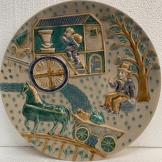 Декоративная тарелка, Художественный Фонд СССР, ЛКСФ (Львовская керамико-скульптурная фабрика), автор БезпалківОльга Володимирівна, Декор выполнен росписью. В исполнении композиции прочитываются черты народного примитивизма и условность в передаче образов