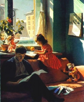 Этот небольшой натюрморт — моя самая любимая картина у Лактионова. Февральская погода может показаться прекрасной в единственном случае: когда смотришь на нее, опираясь на подоконник, где лежат апельсины. На картине — домашнее окно художника.