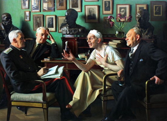 Картину А.И. Лактионова «После операции» (1965) можно причислить к лучшим произведениям художника. Это самая яркая картина о врачах в русской живописи, последняя крупная работа А.И. Лактионова, последний и самый серьезный групповой портрет. А по сложности и глубине замысла, мастерстве исполнения, использованным техническим и технологическим приемам – пожалуй, самое серьезное произведение его творческого пути.