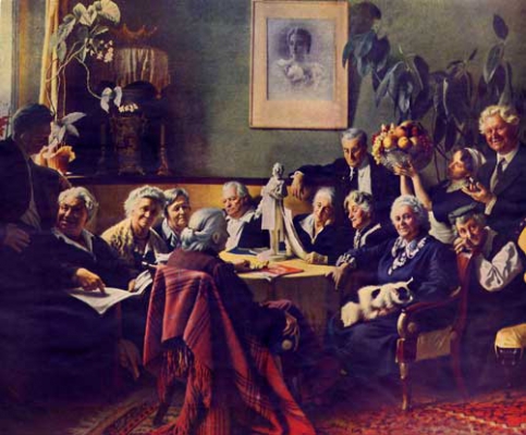 Александр Лактионов. Обеспеченная старость. Ветераны русской сцены в доме Всесоюзного театрального общества имени А.А. Яблочкиной. 1956-1960. Холст, масло, темпера, 280 х 310 см. Киевская картинная галерея